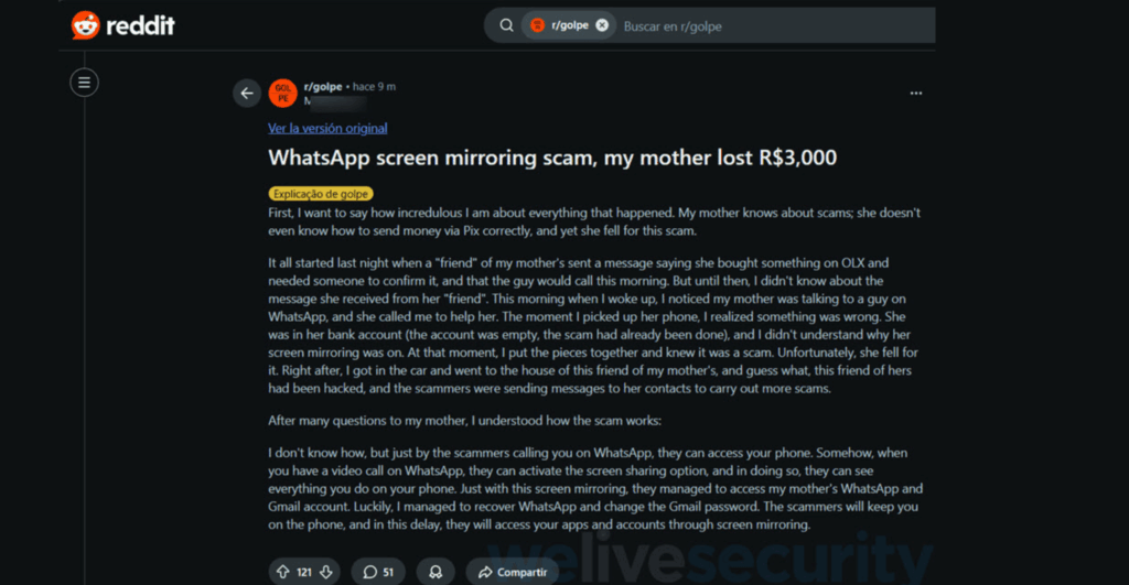 Batizado informalmente de “screen-sharing scam”, esse tipo de fraude usa a função legítima de compartilhamento de tela durante videochamadas do WhatsApp para observar em tempo real tudo que acontece no celular da vítima. Diferente de malwares que precisam infectar o dispositivo, aqui a própria pessoa autoriza o acesso — acreditando estar resolvendo um problema urgente.