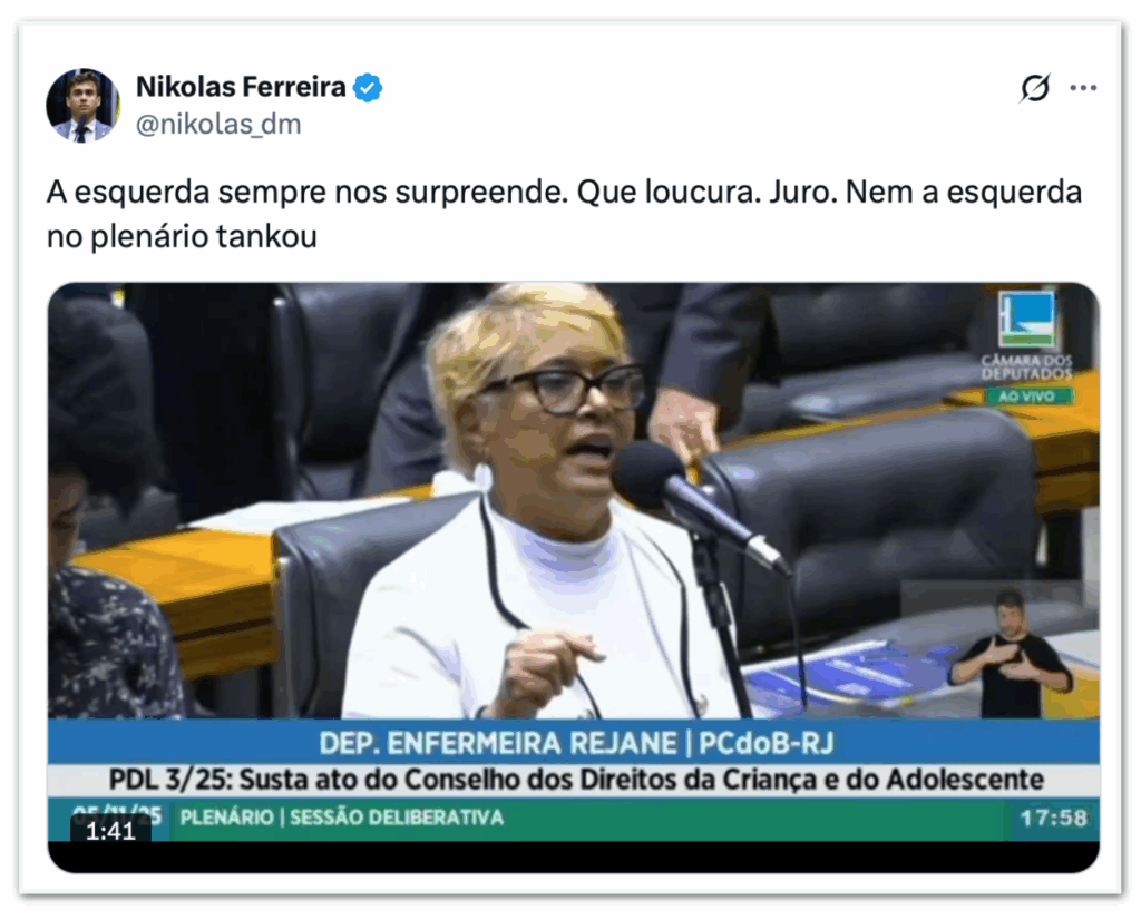 Ao compartilhar o vídeo da discussão na rede social X, o deputado do PL escreveu: “A esquerda sempre nos surpreende. Que loucura. Juro. Nem a esquerda no plenário tankou”.