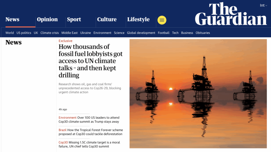 Na 5ª feira (6.nov), o Guardian publicou uma reportagem com o discurso do secretário-geral da ONU, António Guterres, classificando como uma “falha moral” o fato de o mundo estar a caminho de ultrapassar o limite de 1,5 °C de aquecimento. Já nesta 6ª feira (7.nov), publicou sobre a participação dos Estados Unidos na cúpula climática. Além disso, o tema estava na manchete do jornal no final da manhã e no começo da tarde desta 6ª feira (7.nov).