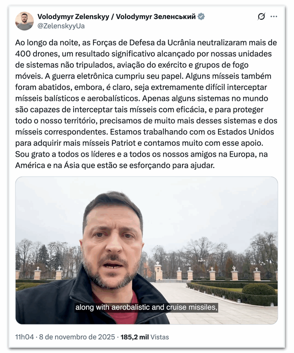 Em publicação nas redes sociais, o presidente Volodymyr Zelensky classificou a operação russa como “massiva” e pediu à comunidade internacional o envio de mais sistemas de defesa aérea, citando negociações em curso com os Estados Unidos para a compra de mísseis Patriot.