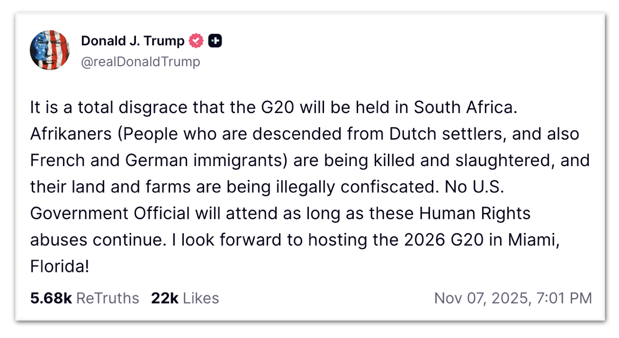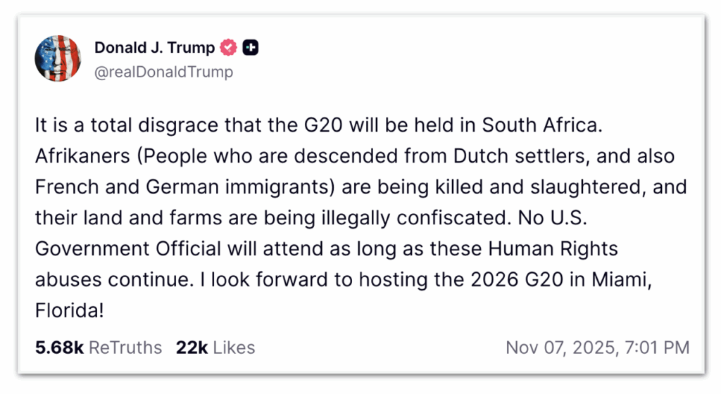 “É uma vergonha total que o G20 seja realizado na África do Sul. Africânderes (pessoas descendentes de colonos holandeses, bem como de imigrantes franceses e alemães) estão sendo mortos e massacrados, e suas terras e fazendas estão sendo confiscadas ilegalmente. Nenhum funcionário do governo dos EUA participará enquanto essas violações dos direitos humanos continuarem. Aguardo com expectativa sediar o G20 de 2026 em Miami, na Flórida”, declarou Trump.