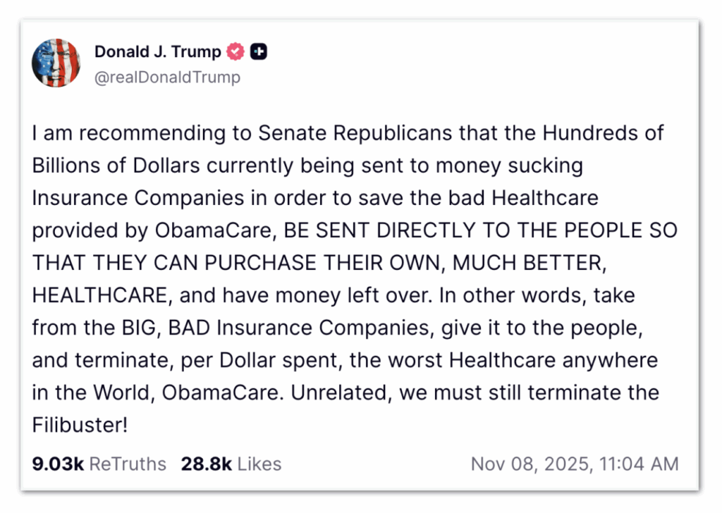 “Estou recomendando aos republicanos do Senado que as centenas de bilhões de dólares atualmente enviados às companhias de seguro, que sugam dinheiro para salvar o péssimo sistema de saúde do Obamacare, sejam enviados diretamente às pessoas, para que possam comprar seu próprio seguro de saúde, muito melhor, e ainda ter dinheiro sobrando”, escreveu Trump em seu perfil no Truth Social.
