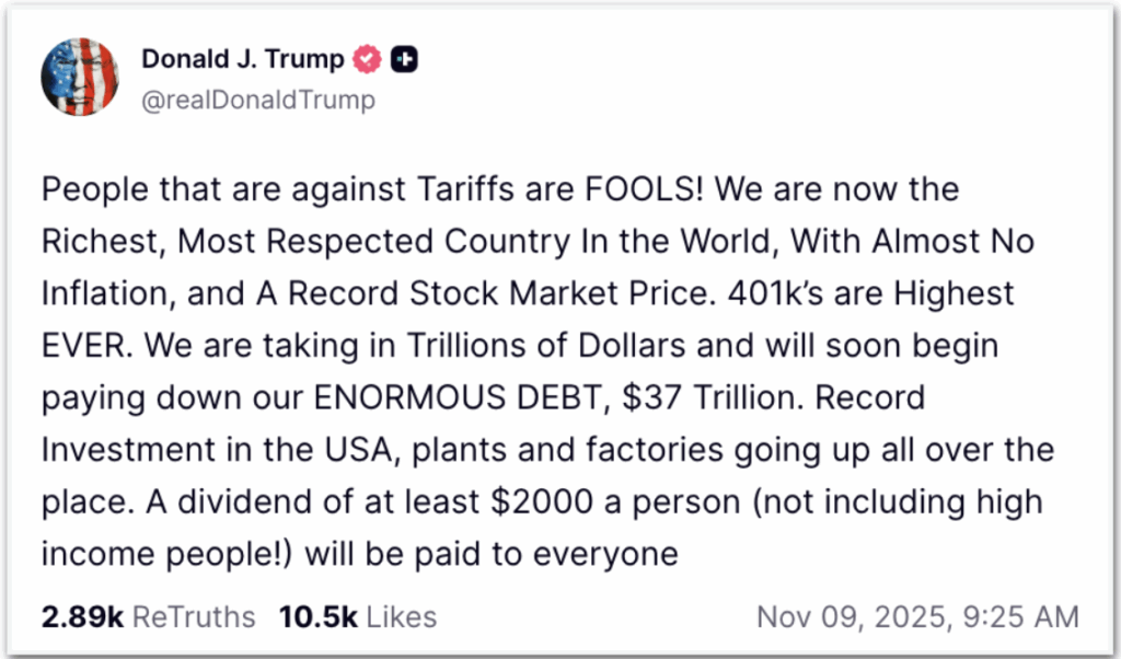 “Estamos arrecadando trilhões de dólares e em breve começaremos a pagar nossa ENORME DÍVIDA, de 37 trilhões. Investimentos recordes nos EUA, fábricas e plantas surgindo por todo o país. Um dividendo de pelo menos US$ 2.000 por pessoa (sem incluir pessoas de alta renda!) será pago a todos”, escreveu o republicano.