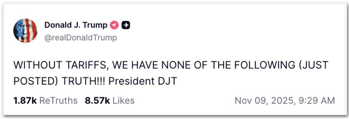 “SEM TARIFAS, NÃO TERÍAMOS NENHUM DOS SEGUINTES (RECÉM-POSTADOS) FATOS!!!”, complementou.