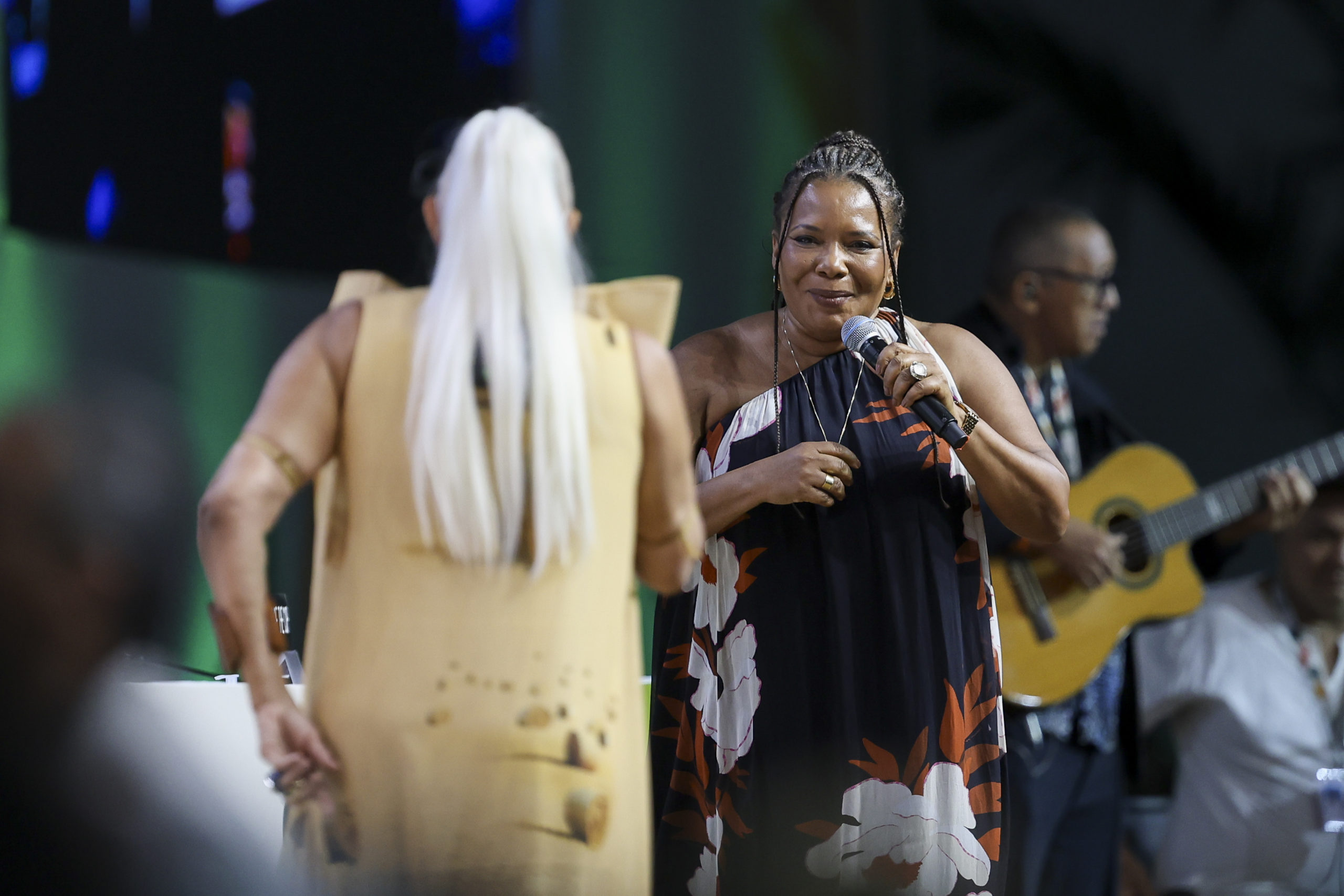 As cantoras Fafá de Belém e MargaethMenezes contam na abertua da COP30 – A Cúpula de Líderes que antecede a COP30. COP30, que acontece de 10 a 21 de novembro em Belém. É a 1ª vez que o Brasil sedia a conferência climática da ONU desde a ECO-92, realizada no Rio de Janeiro. A expectativa é que a COP30 reúna cerca de 55.000 pessoas, entre delegações oficiais, representantes da sociedade civil e imprensa internacional, segundo o governo brasileiro. | Sérgio Lima/Poder360 – 10.nov.2025