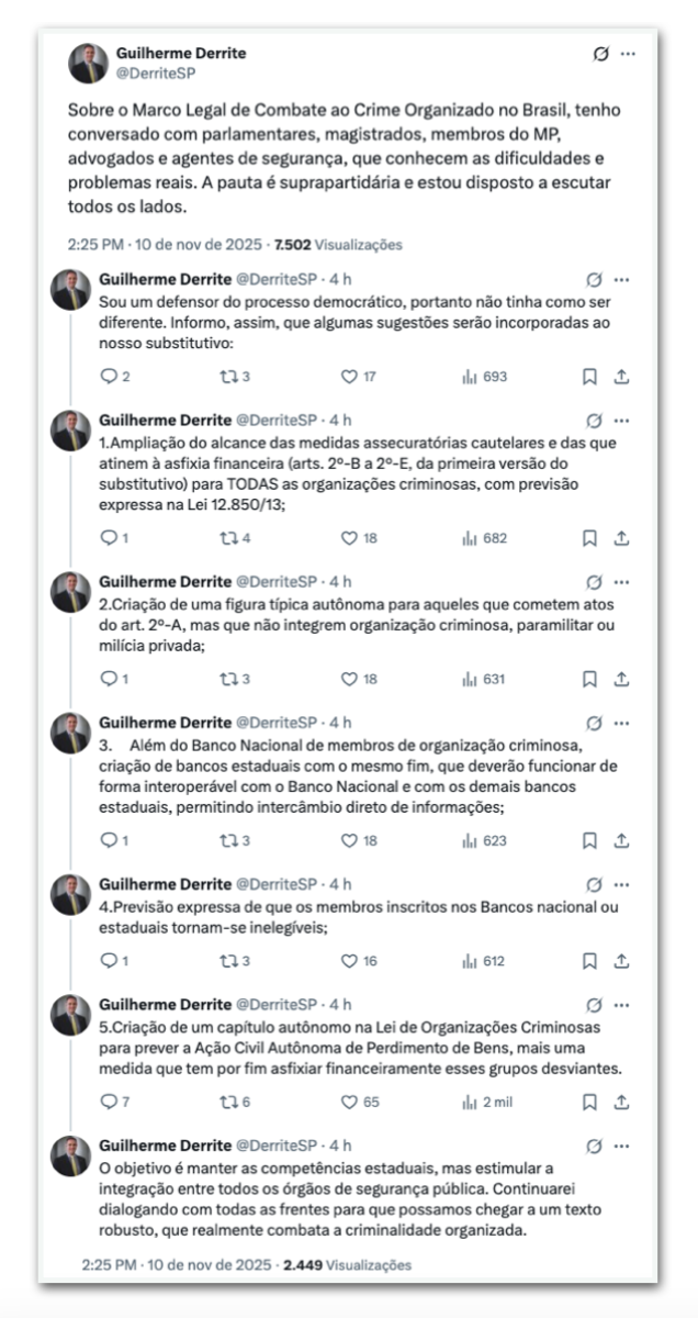 Em seu perfil oficial no X, Derrite anunciou as alterações: “O objetivo é manter as competências estaduais, mas estimular a integração entre todos os órgãos de segurança pública. Continuarei dialogando com todas as frentes para que possamos chegar a um texto robusto, que realmente combata a criminalidade organizada”.