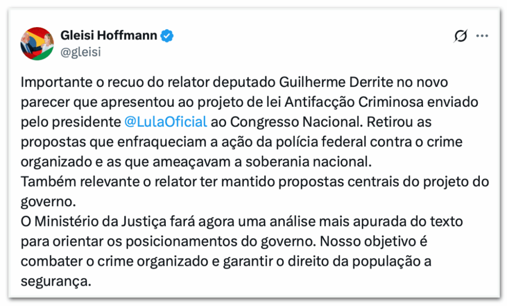 “O Ministério da Justiça fará agora uma análise mais apurada do texto para orientar os posicionamentos do governo. Nosso objetivo é combater o crime organizado e garantir o direito da população à segurança”, afirmou Gleisi, também em publicação no X.