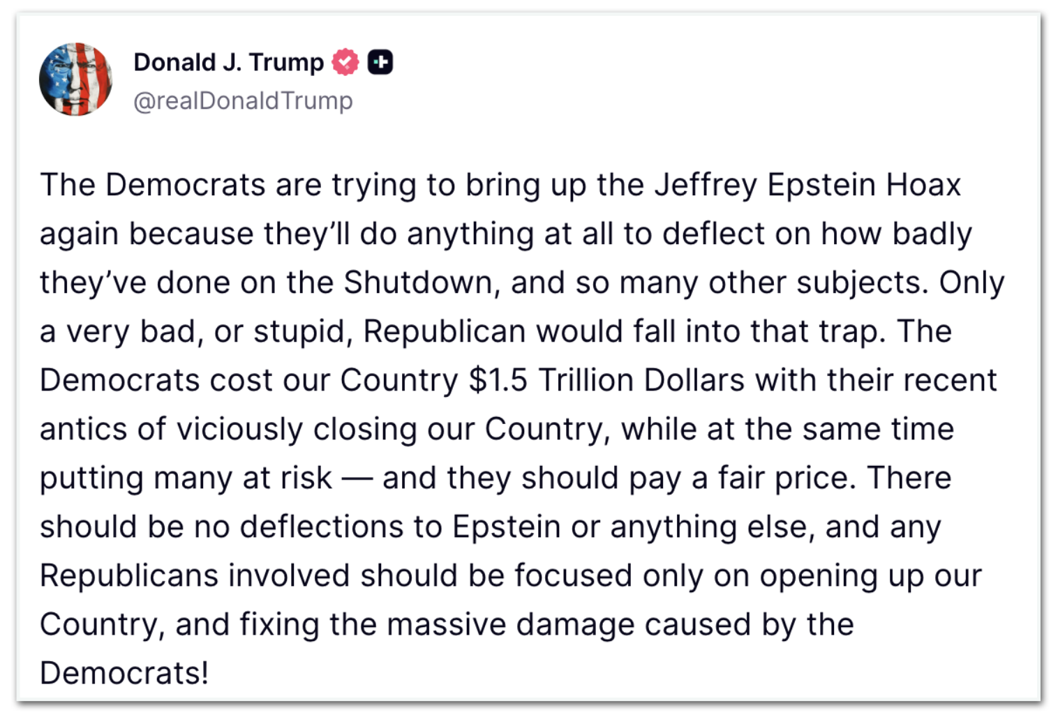 Em publicação na rede Truth Social, Trump afirmou que os democratas traziam à tona a “farsa” de Epstein para desviar a atenção do shutdown do governo norte-americano, encerrado no fim da noite de 4ª feira (12.nov).
