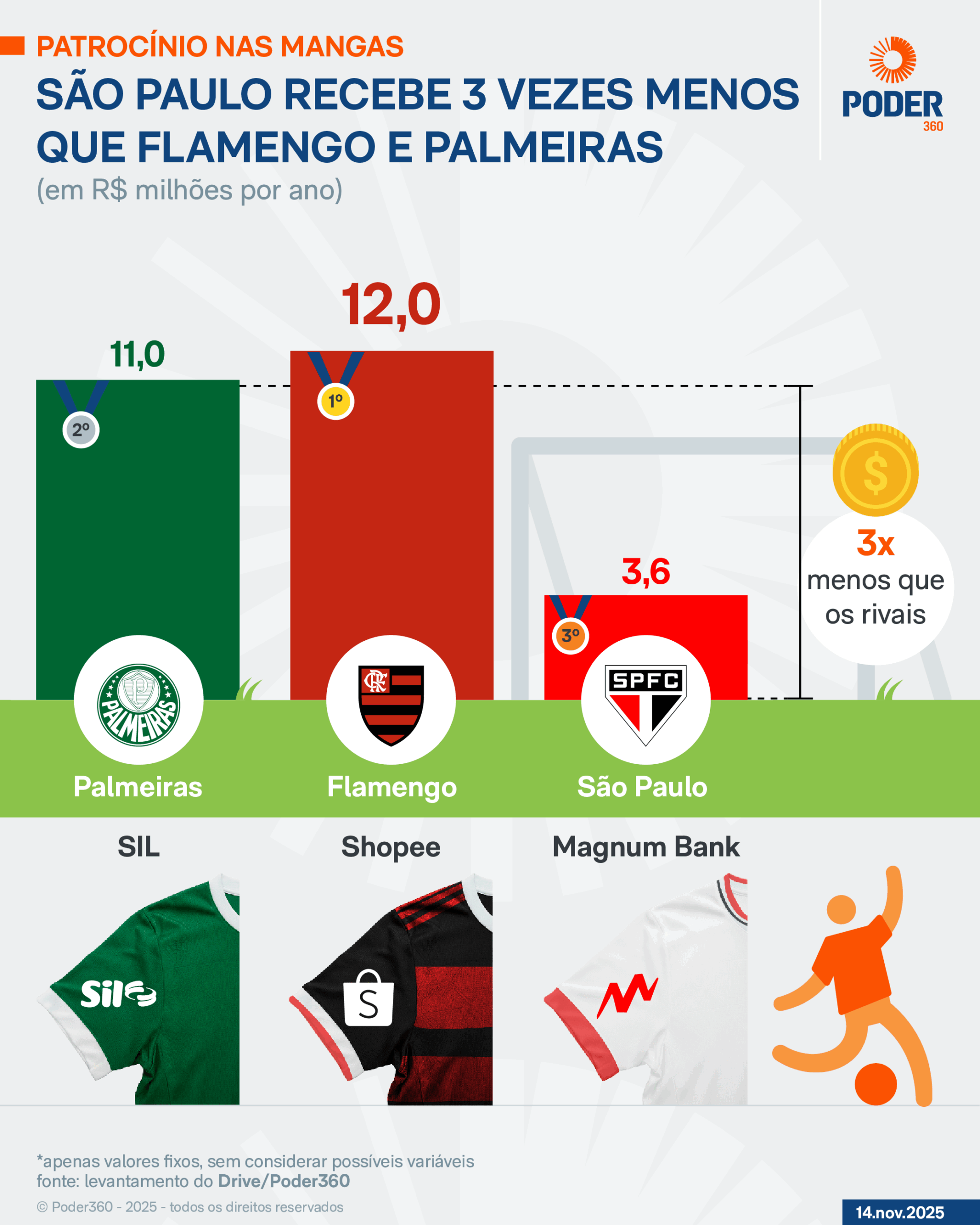 O São Paulo confirmou na 5ª feira (13.nov.2025) um acordo de R$ 3,6 milhões anuais fixos com o Magnum Bank, banco digital que estampará as mangas do uniforme tricolor a partir de 2026. O acordo é válido até 2031.