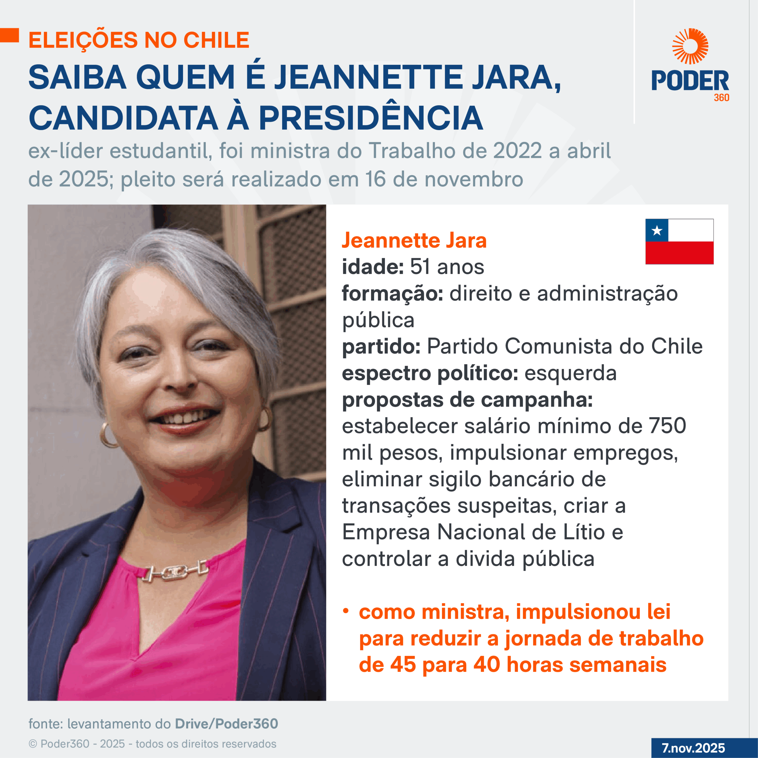 Os eleitores chilenos definiram neste domingo (16.nov.2025) que o 2º turno das eleições presidenciais do Chile, marcado para 14 de dezembro. José Antonio Kast (Partido Republicano, direita) vai enfrentar a governista Jeannette Jara (Partido Comunista, esquerda).