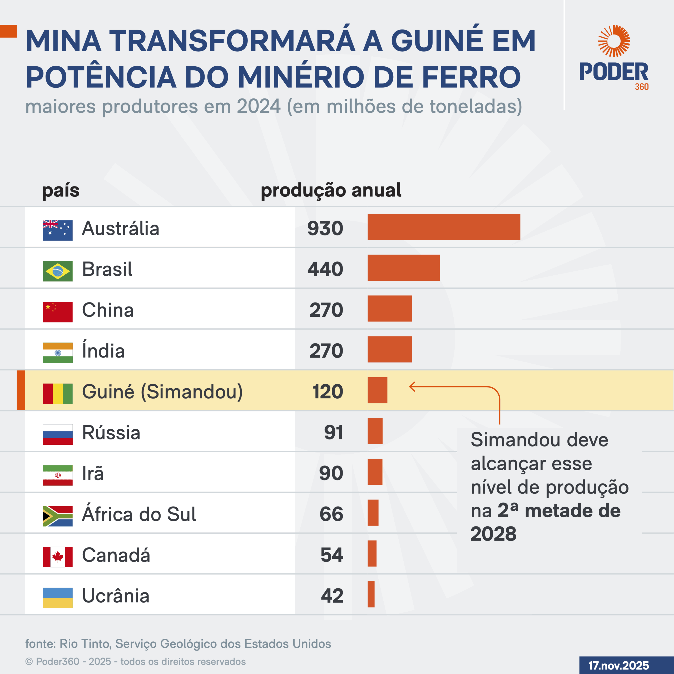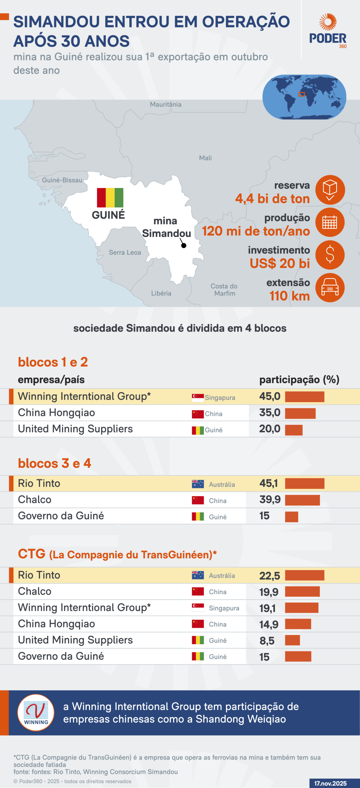 A Rio Tinto ocupa o top 3 do setor de mineração junto com a Vale e a BHP. Segundo um relatório divulgado em outubro, Simandou deve alcançar uma produção de 120 milhões de toneladas anuais a partir da 2ª metade de 2028. Eis a íntegra (PDF – 304 kB, em inglês).