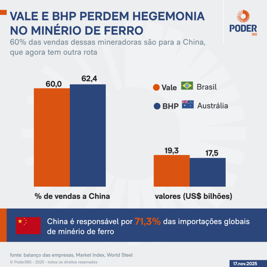 Segundo o site especializado World Steel, a China importou 1,2 bilhão de toneladas de minério de ferro em 2024. Isso é 71,3% de todas as exportações do planeta. Desse total, 60% é proveniente da Austrália e 21% do Brasil.