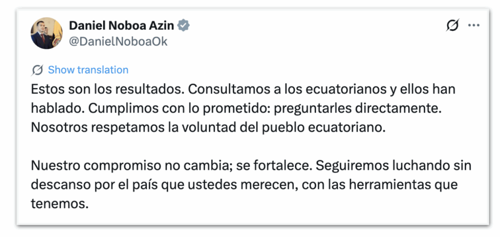 ” Esses são os resultamos. Consultamos os equatorianos e eles falaram. Cumprimos o prometido: perguntar-lhes diretamente. Nós respeitamos a vontade do povo equatoriano. Nosso compromisso não muda; se fortalece. Seguimos lutando sem descanso para o país que vocês merecem, com as ferramentas que temos”, disse Noboa no X.