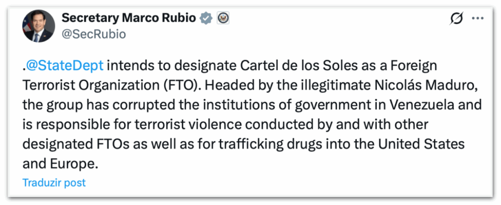 Os EUA dizem que o governo venezuelano mantém vínculos com o narcotráfico. No domingo (16.nov), o secretário de Estado dos EUA, Marco Rubio, afirmou na rede social X que o Departamento de Estado designaria o Cartel de los Soles como uma “organização terrorista estrangeira”, o que torna crime para qualquer pessoa nos EUA fornecer apoio material ao grupo. Autoridades norte-americanas acusam o Cartel de los Soles de trabalhar com a organização Tren de Aragua para enviar narcóticos ao país.