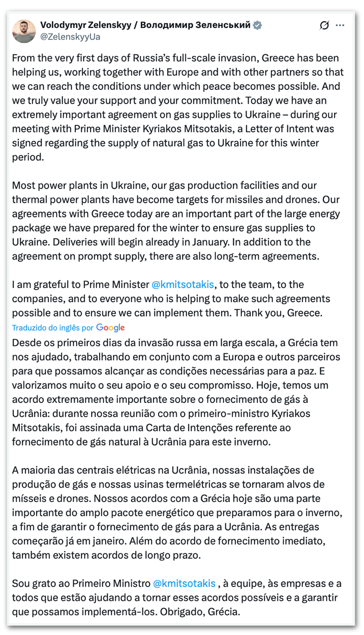 Segundo o presidente, ataques russos comprometeram unidades essenciais da infraestrutura energética ucraniana. “A maioria das usinas elétricas na Ucrânia, nossas instalações de produção de gás e nossas usinas termelétricas se tornaram alvos de mísseis e drones. Nossos acordos com a Grécia hoje são uma parte importante do grande pacote de energia que preparamos para o inverno para garantir o abastecimento de gás para a Ucrânia. As entregas começarão já em janeiro. Além do acordo de fornecimento imediato, também há acordos de longo prazo”.