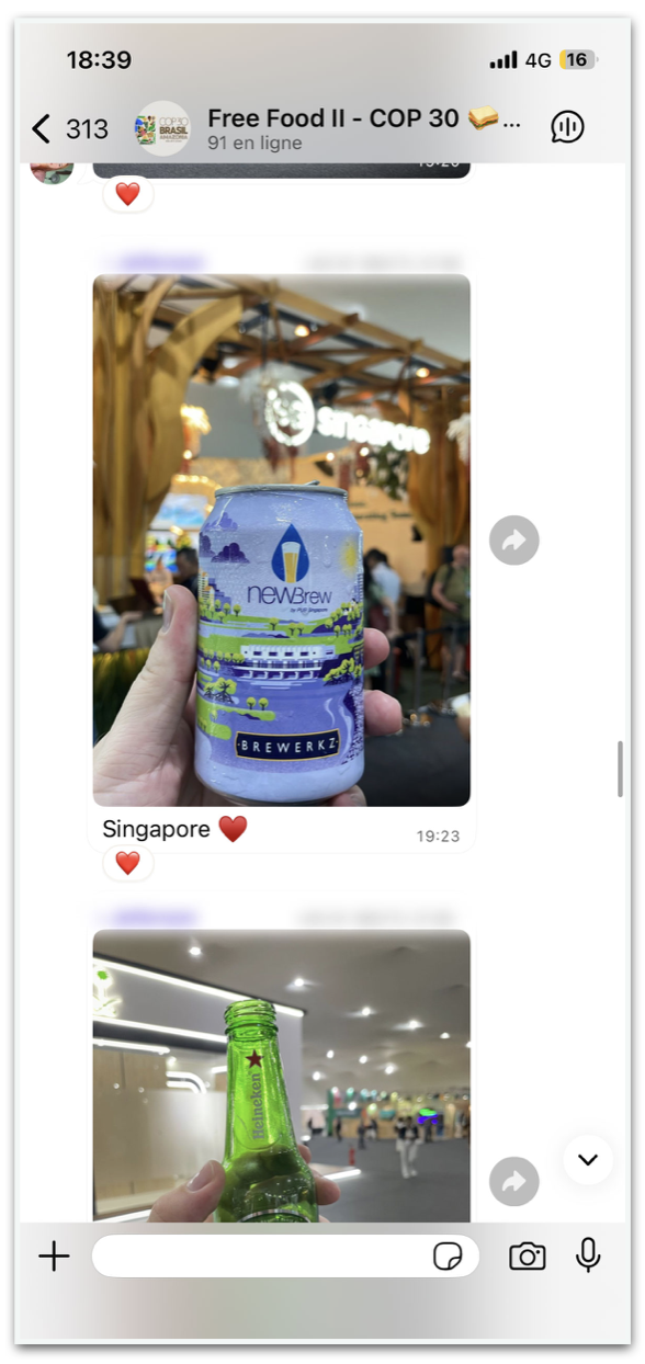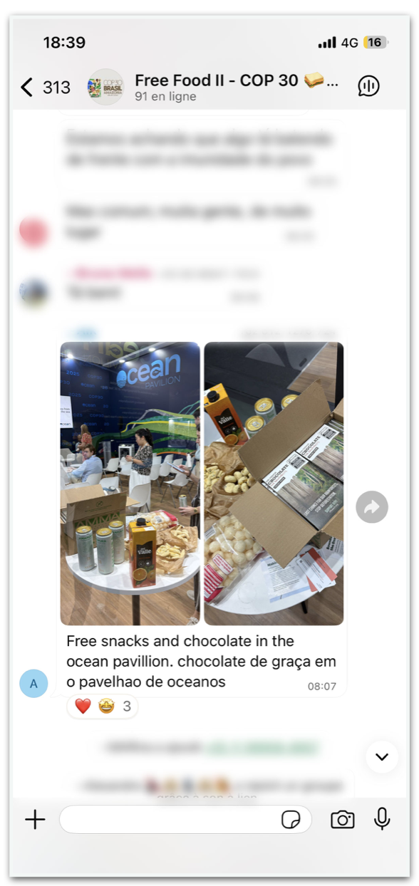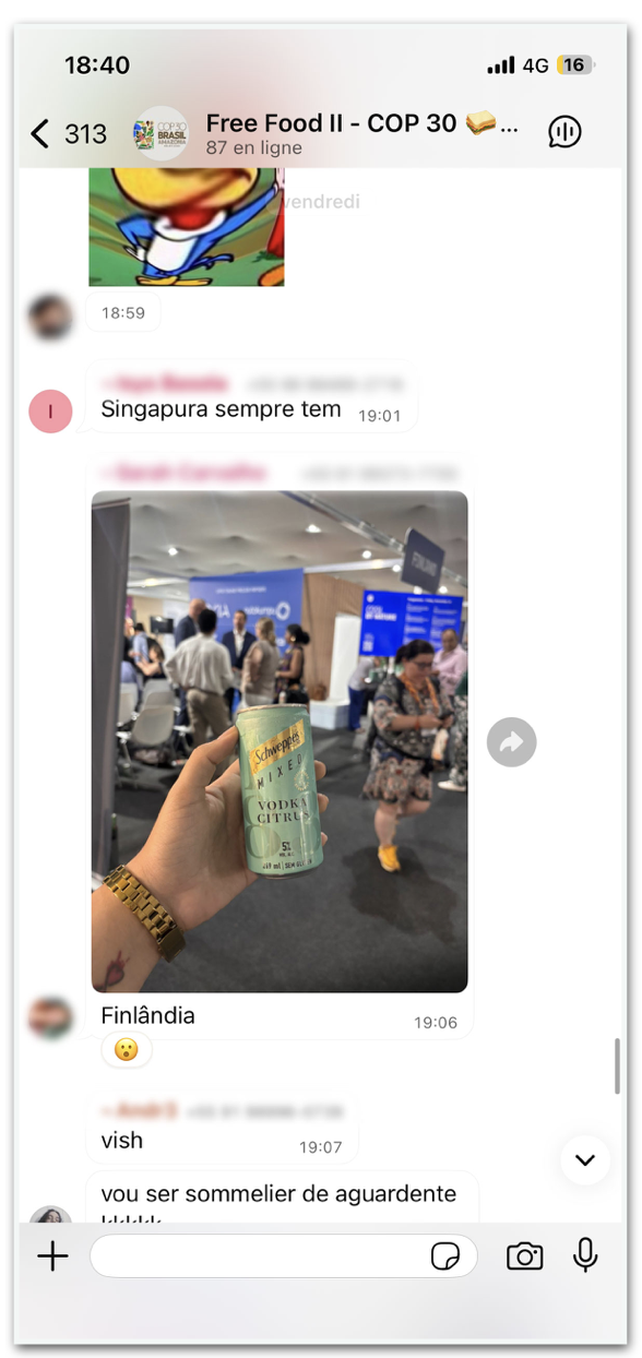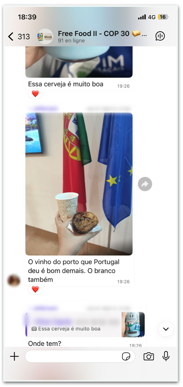 Uma outra solução é o grupo de conversa do WhatsApp: “Free Food II – COP30”, a que o Poder360 teve acesso. A comunidade na rede social foi criada em 2021, durante a COP26, em Glasgow, na Escócia.