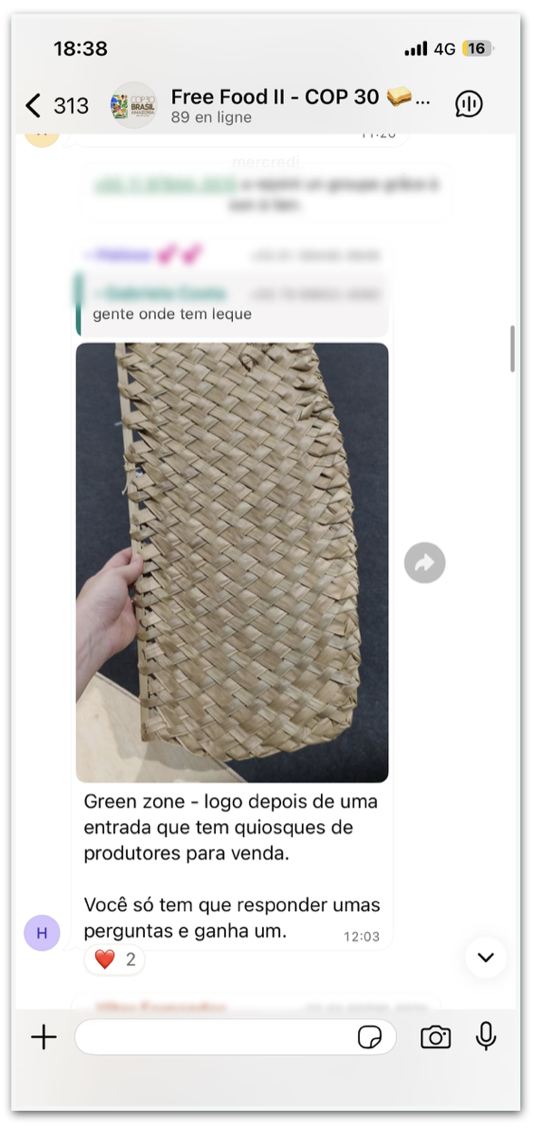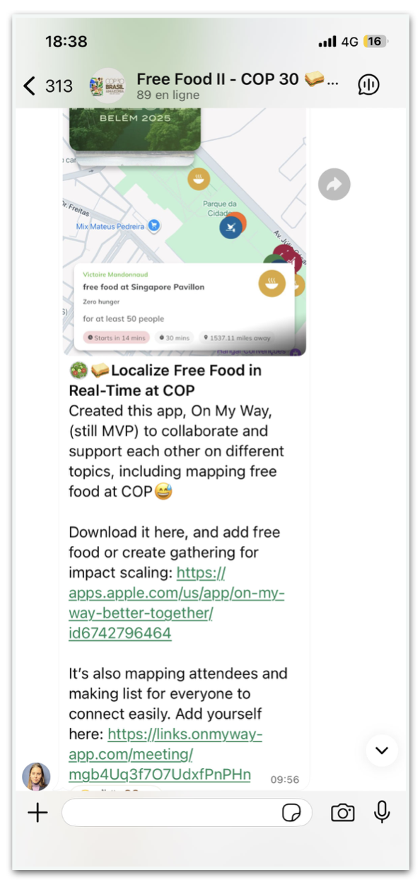 A desenvolvedora francesa Victoire Mandonnaud divulga o app On My Way no grupo de WhatsApp para comidas de graça na COP30