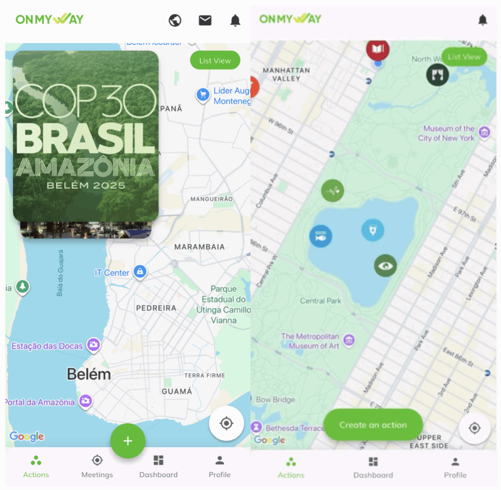 No aplicativo, os usuários podem criar uma “ação local” inserindo um título e uma descrição sobre o que se trata o evento. Quando postado, a rede é notificada e o local da ação é apontado com um alfinete fixado no mapa. Na COP30, os usuários têm destacado onde há comidas e bebidas de graça nos pavilhões dos países.