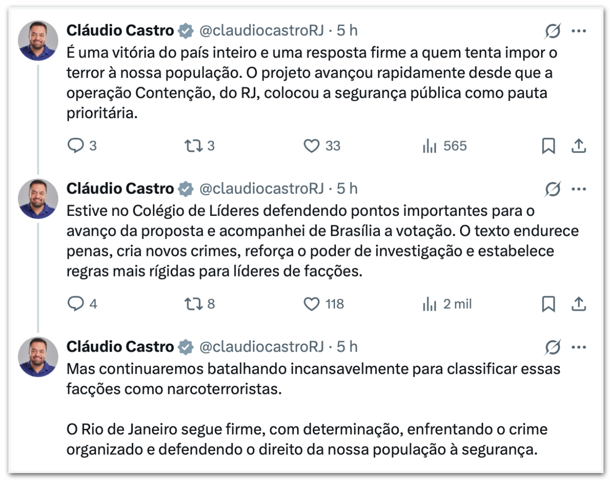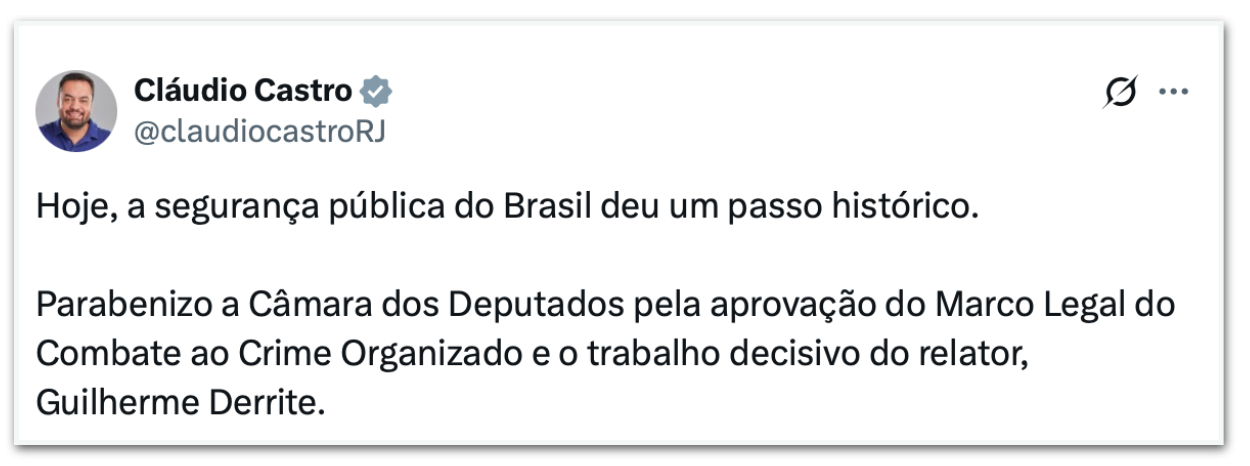 O governador do Rio de Janeiro, Cláudio Castro (PL), disse que “o projeto avançou rapidamente desde que a operação Contenção colocou a segurança pública como pauta prioritária”. A operação citada por Castro foi deflagrada em 28 de outubro nos Complexos do Alemão e da Penha. Deixou 121 mortos –a mais letal da história.