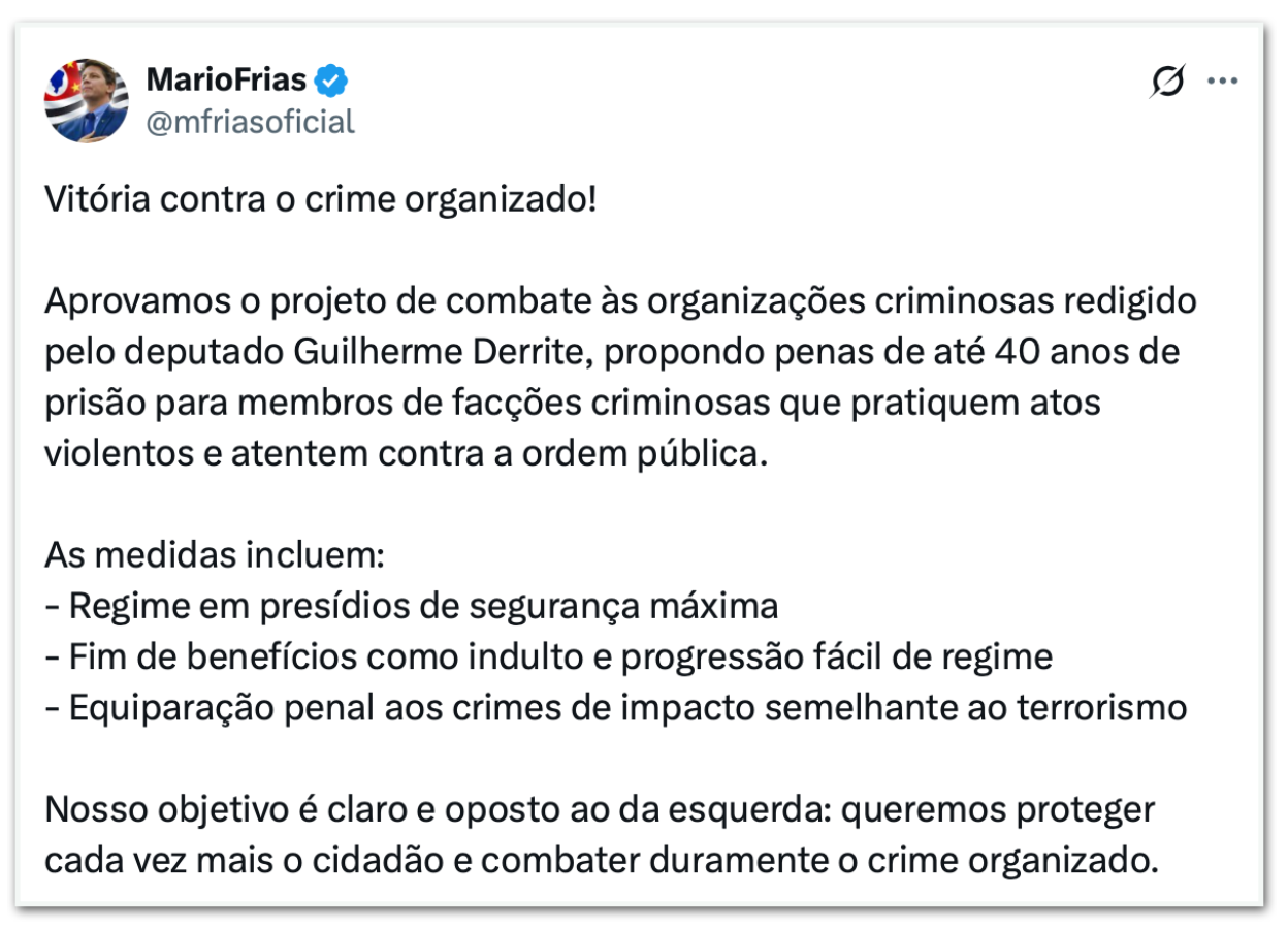 O deputado federal Mario Frias (PL-SP) listou algumas medidas do texto aprovado, como “regime em presídios de segurança máxima”, “fim de benefícios como indulto e progressão fácil de regime” e “equiparação penal aos crimes de impacto semelhante ao terrorismo”.