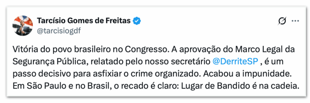 O congressista disse: “Nosso objetivo é claro e oposto ao da esquerda: queremos proteger cada vez mais o cidadão e combater duramente o crime organizado”.