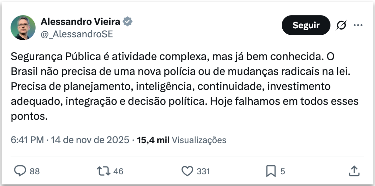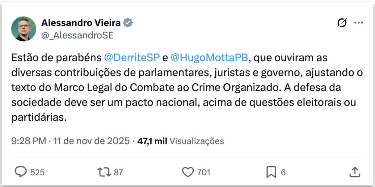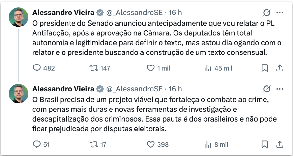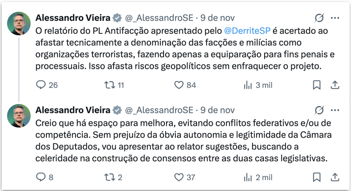Leia o que Alessandro Vieira já publicou sobre o PL Antifacção: