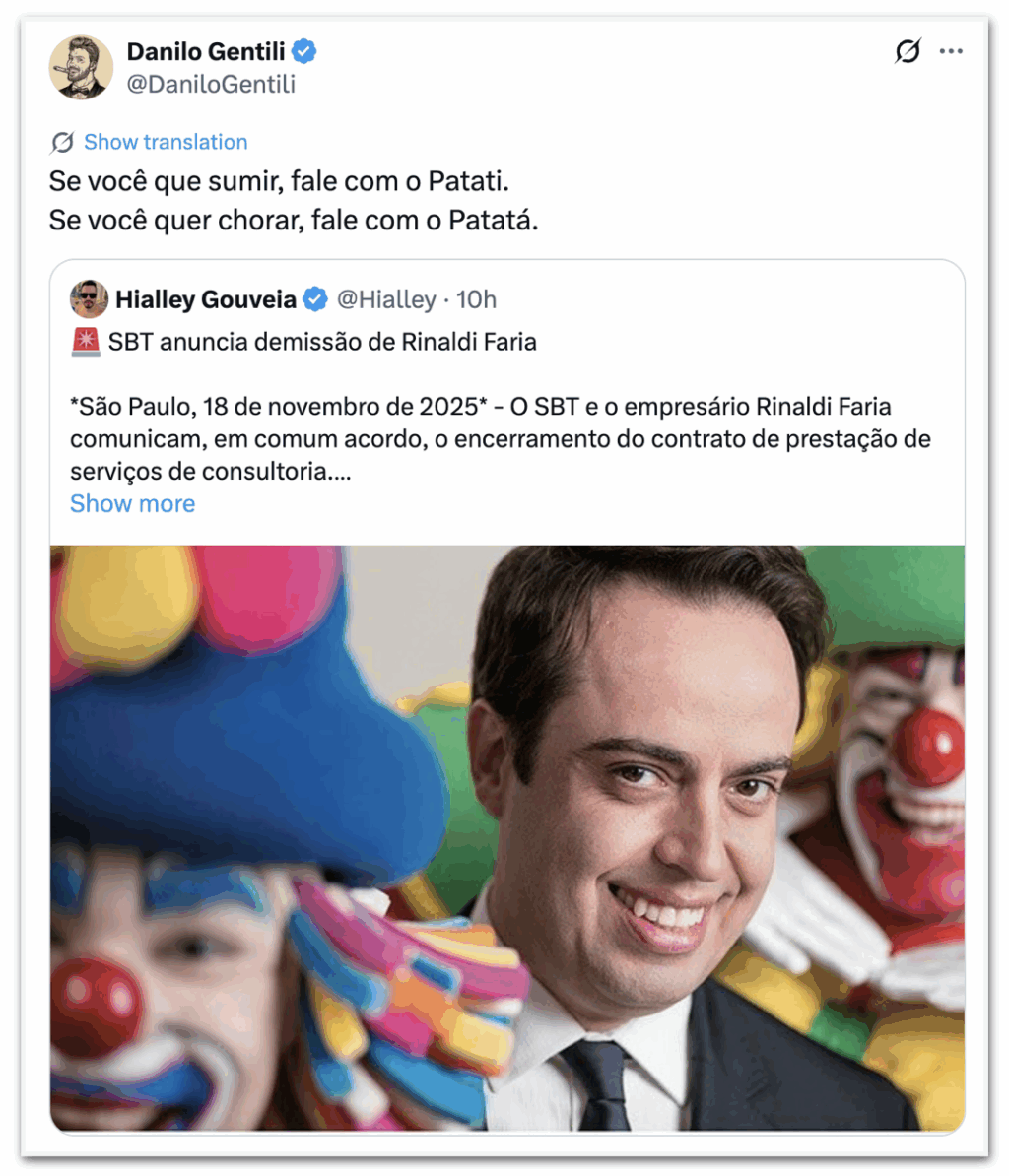 “São Paulo, 18 de novembro de 2025 – O SBT e o empresário Rinaldi Faria comunicam, em comum acordo, o encerramento do contrato de prestação de serviços de consultoria.
