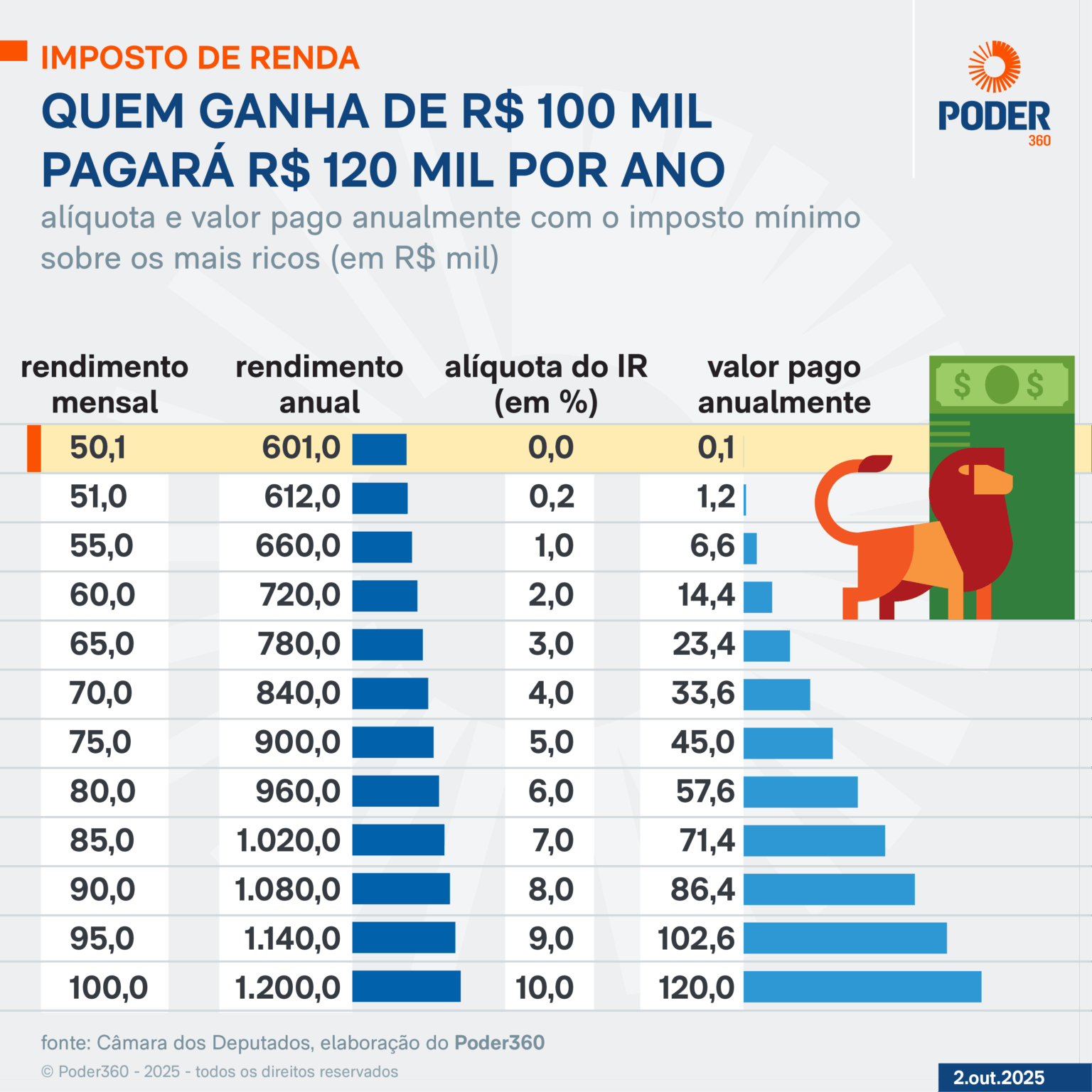 Os alvos do tributo mínimo são os brasileiros que recebem R$ 50.000 por mês (ou R$ 600 mil por ano). Para os rendimentos iguais ou superiores a R$ 1,2 milhão, a alíquota mínima do Imposto de Renda será de 10%. Haverá uma equação para definir a alíquota do brasileiro que ganha de R$ 600 mil a R$ 1,2 milhão ou mais por ano.