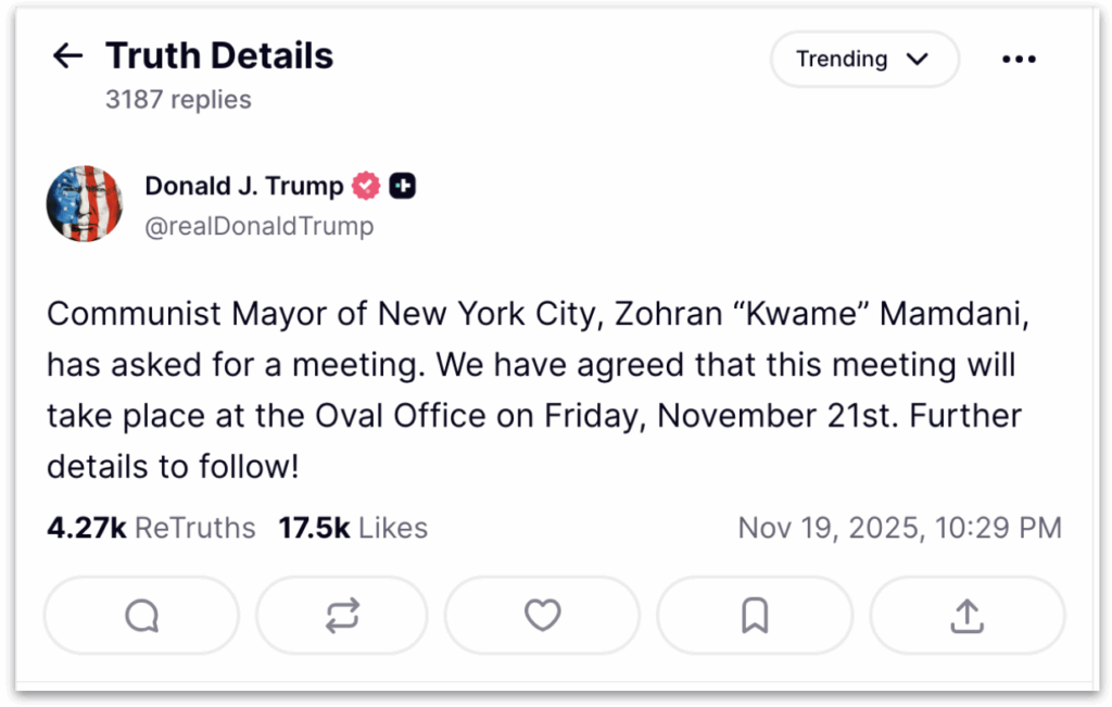 O anúncio da reunião se deu depois de um histórico de confrontos públicos entre ambos. Na publicação, Trump informou que Mamdani havia solicitado o encontro e o chamou de “Prefeito Comunista de Nova York”.