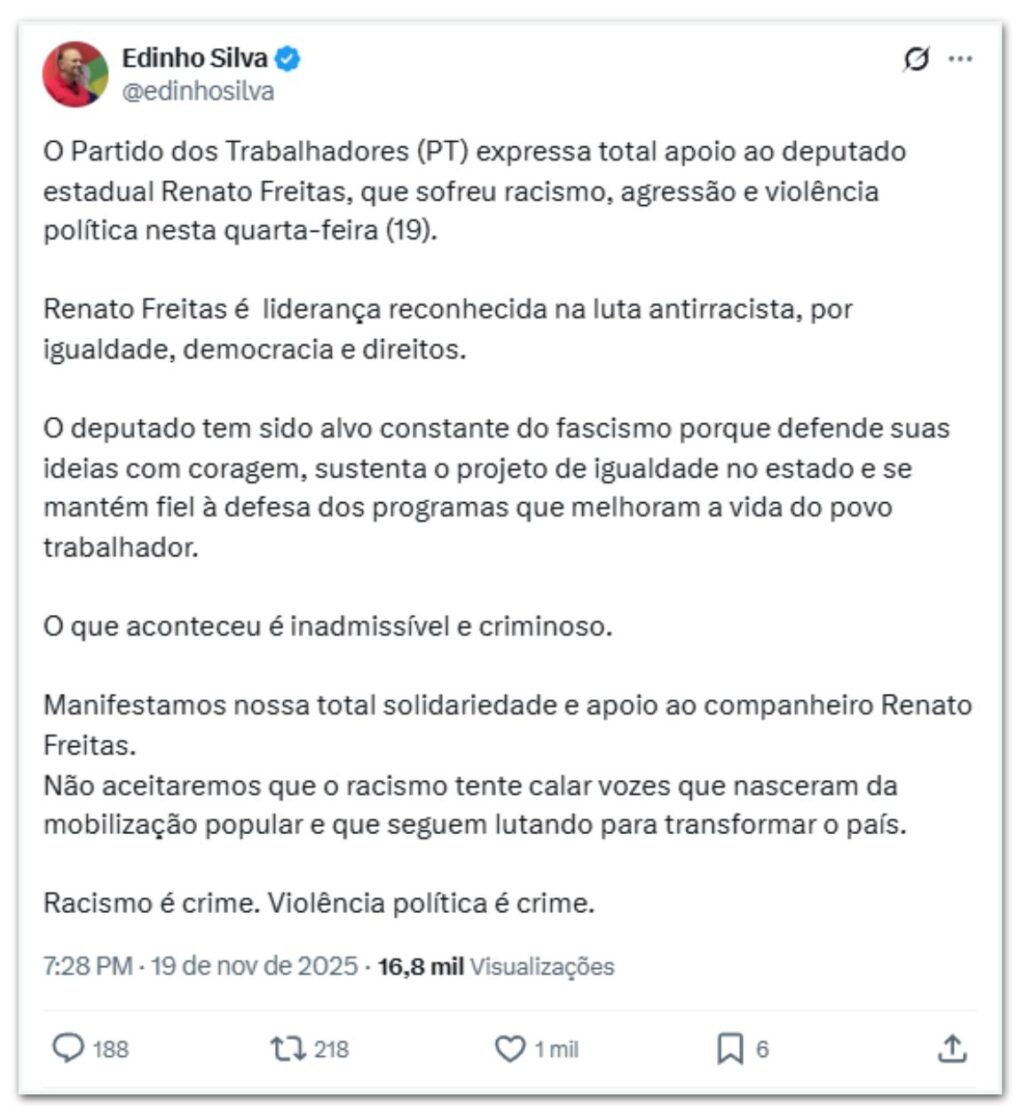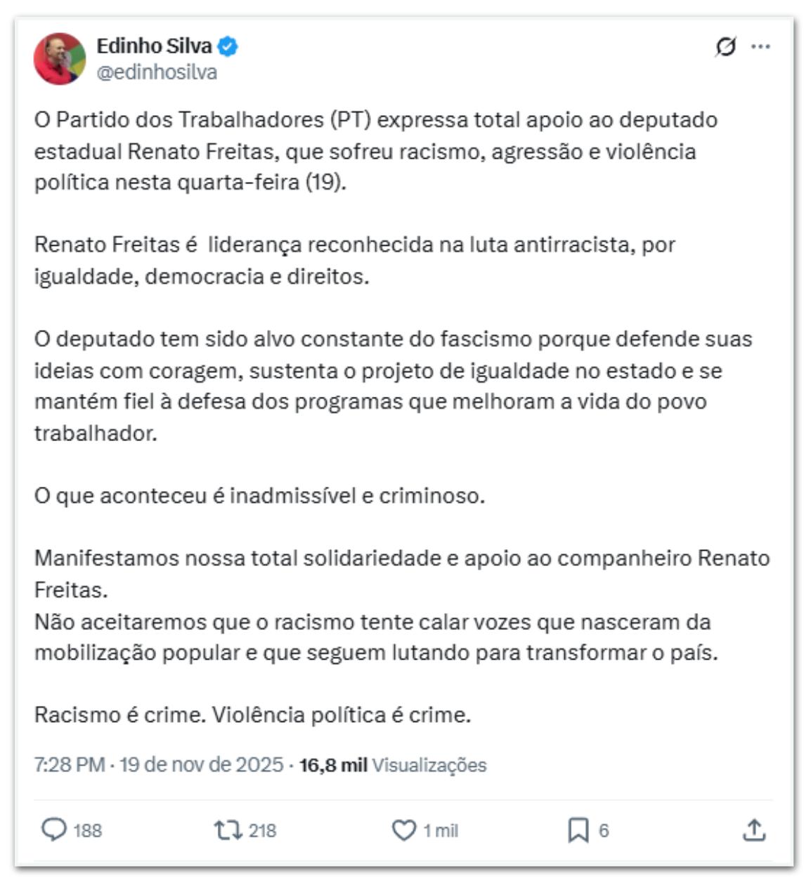 O deputado estadual Renato Freitas (PT-PR), que viralizou na 4ª feira (19.nov.2025) nas redes sociais por causa de uma briga no centro de Curitiba, disse que foi vítima de racismo no caso. Ele recebeu apoio de aliados, inclusive de Edinho Silva, presidente do PT.