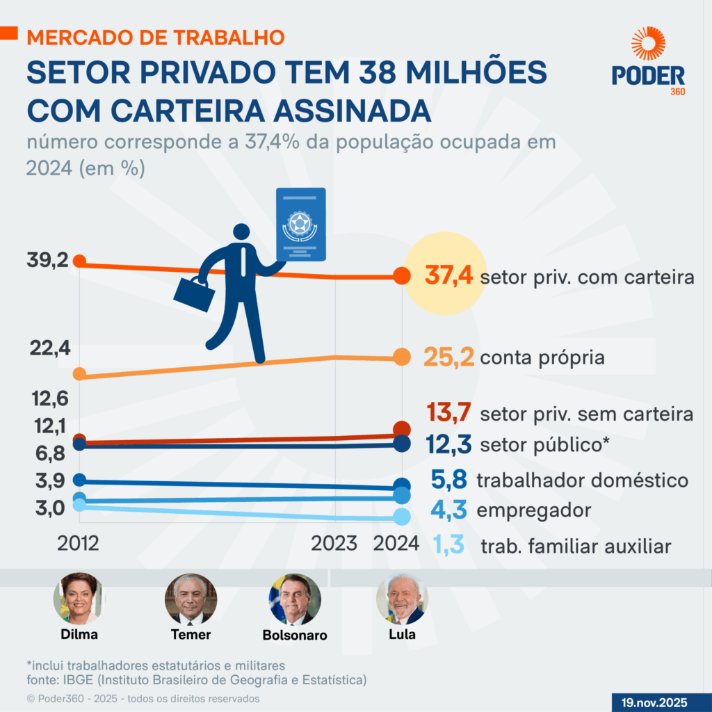 No setor público, a quantidade de empregados quase não variou de 2012 a 2024. Permaneceu na faixa de 12% da população ocupada. No ano passado, o segmento tinha 12,4 milhões de trabalhadores, incluindo funcionários públicos estatutários e militares.