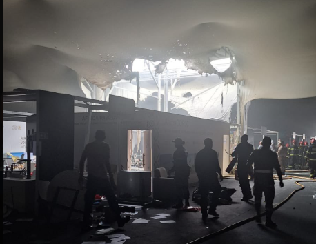 Técnicos da organização do evento e profissionais do Corpo de Bombeiros realizam investigações para determinar a origem exata do incêndio que atingiu as instalações.