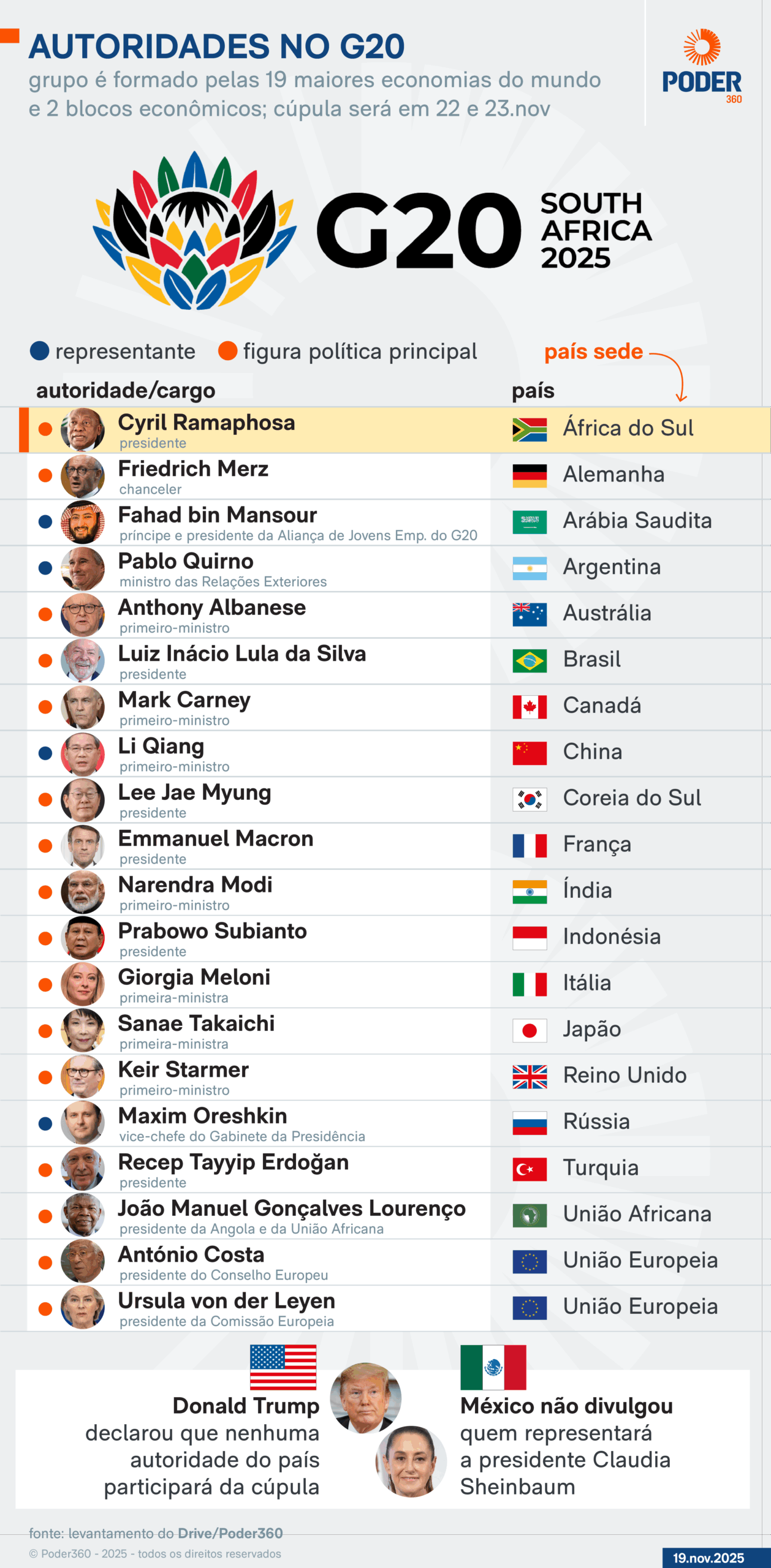 Donald Trump (Partido Republicano), presidente dos Estados Unidos, declarou em 7 de novembro que nenhuma autoridade do país vai comparecer à cúpula do G20. Ele acusa a África do Sul de perseguir descendentes de colonos europeus e violar direitos humanos. O governo norte-americano seria representado pelo vice-presidente JD Vance, mas a viagem foi cancelada.