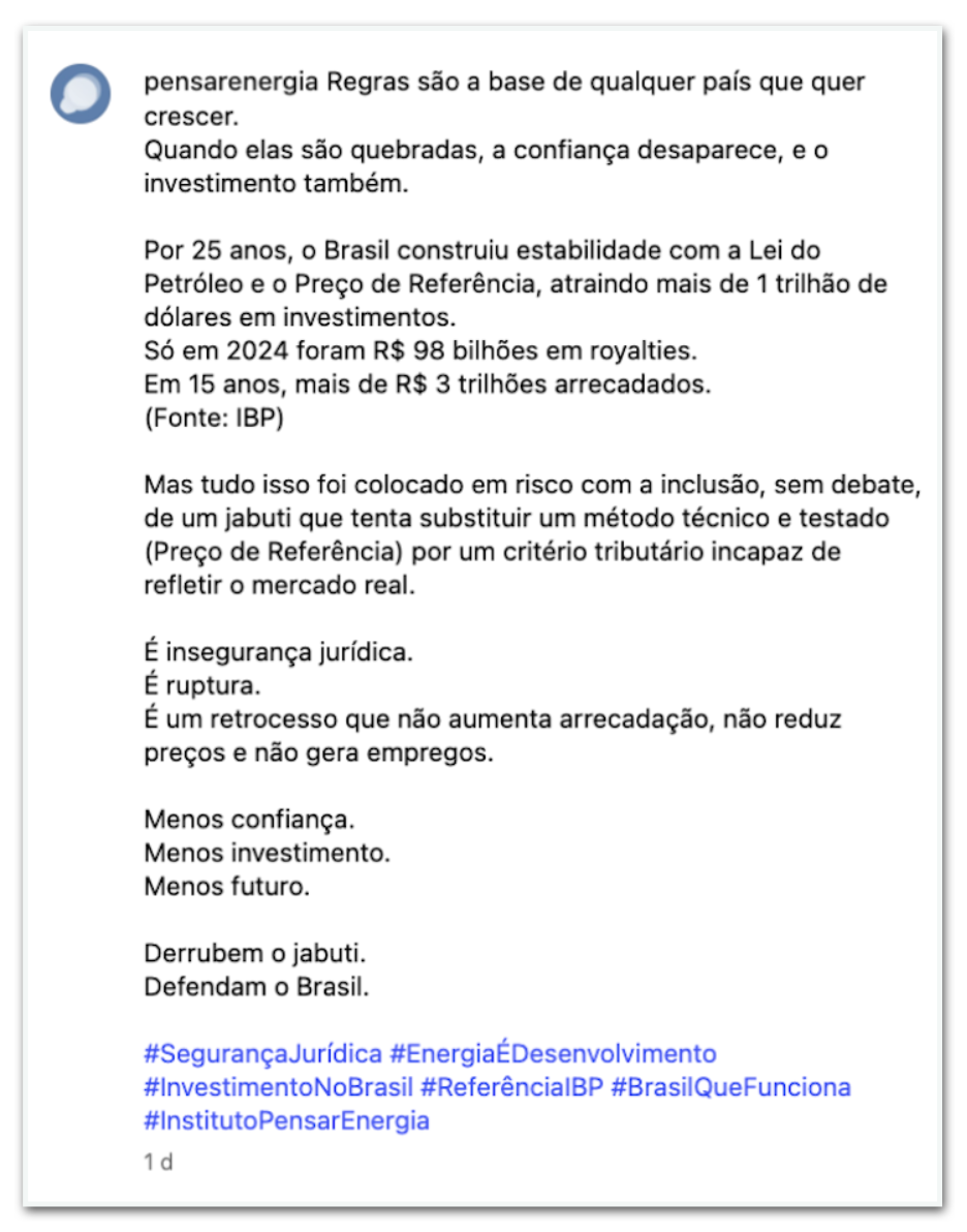 “Por 25 anos, o Brasil construiu estabilidade com a Lei do Petróleo e o Preço de Referência […] Regras são a base de qualquer país que quer crescer. Quando elas são quebradas, a confiança desaparece, e o investimento também”, escreveu.