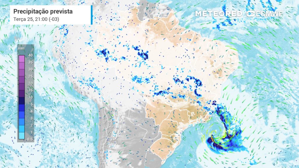 O ciclone se forma de fato na terça-feira (25), não trazendo potencial de ventos intensos, mas ajudando na organização da umidade entre as regiões Sudeste, Nordeste e Centro-Oeste até a Região Norte. Essa condição mantém os alertas de chuvas intensas para o Espírito Santo, Minas Gerais, sul e oeste da Bahia, em Goiás, Tocantins, sul do Pará, Amazonas, Rondônia e Acre.