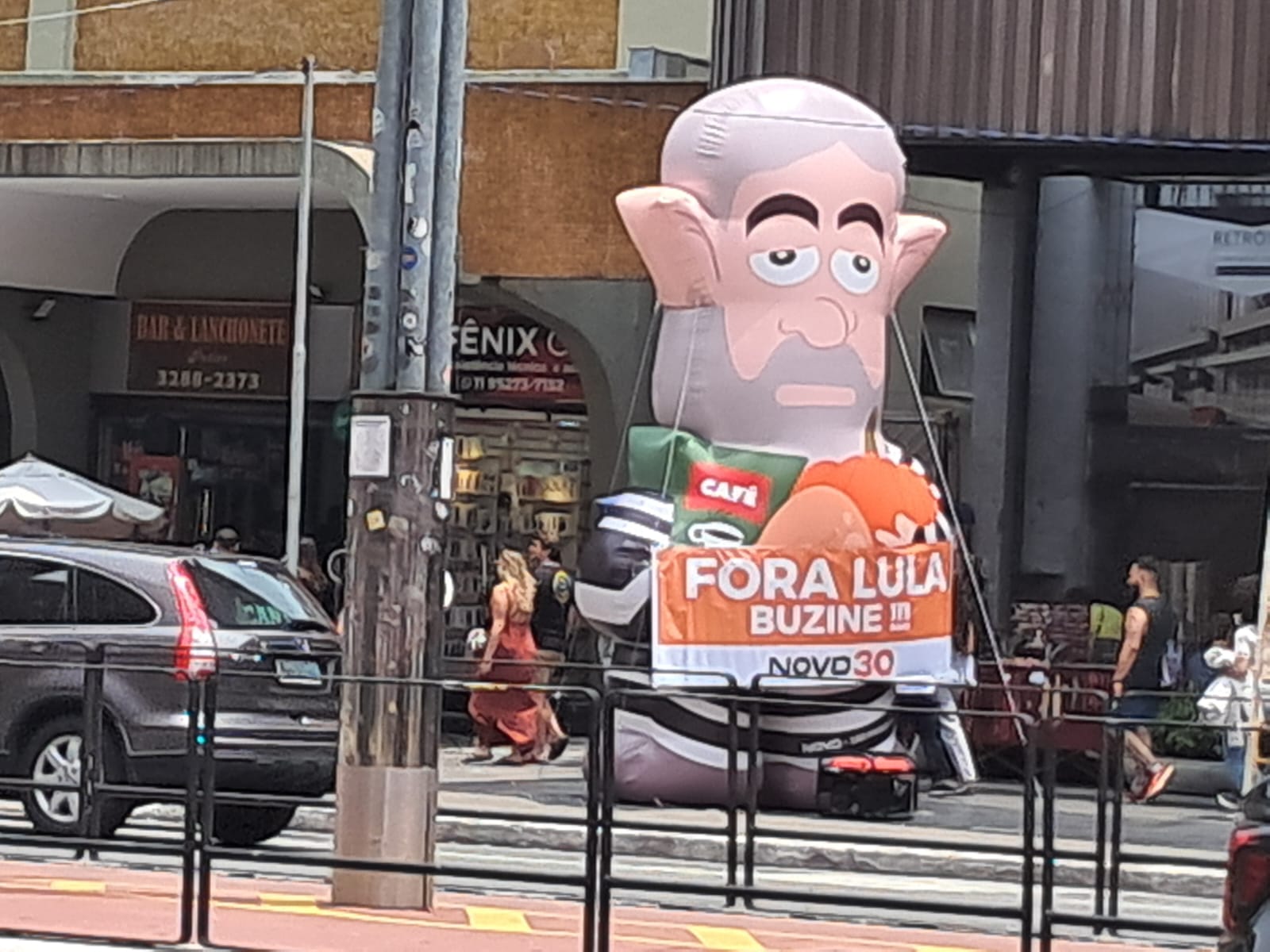 Um pixuleco (boneco de plástico) de Bolsonaro vestido de presidiário chegou a ser inflado no local. Mas o gerador não conseguiu mantê-lo cheio. A 200 metros dali, o partido Novo, apoiador do ex-presidente, manteve cheio um pixuleco de Lula vestido de presidiário.