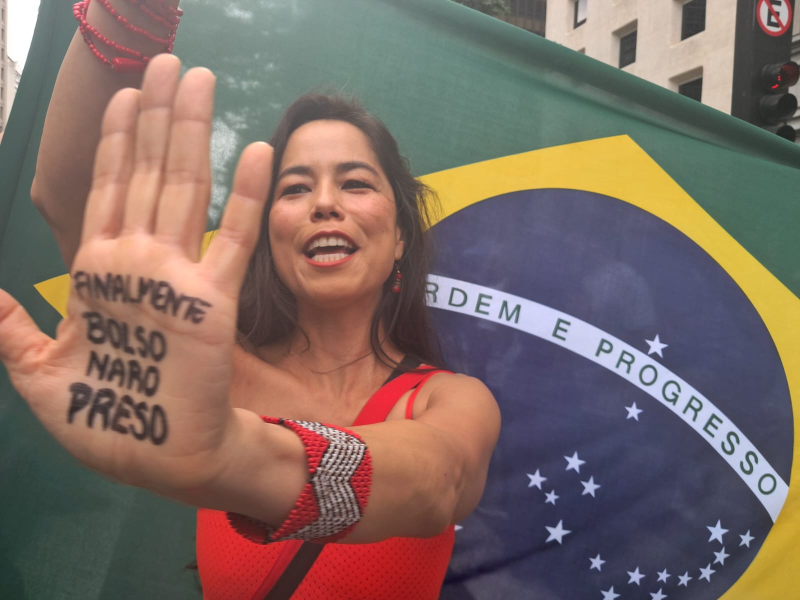 Manifestante mostra frase escrita em sua mão: Finalmente Bolsonaro preso”