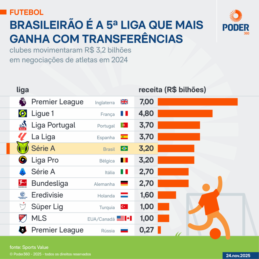 Em direitos de transmissão, o Brasileirão ocupa a 10ª colocação, com cerca de R$ 3,2 bi em receita. O 1º lugar fica com a NFL (National Football League), com quase R$ 65 bi.
