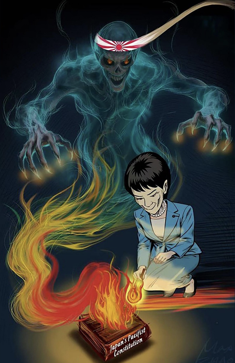 No Instagram, a Xinhua –principal agência de notícias do governo chinês– publicou ao menos 3 charges ironizando Takaichi. Em uma delas, a premiê está de mãos dadas com um fantasma vestido com um boné que remete ao exército japonês da 2ª Guerra Mundial, com “militarismo” escrito em seu corpo e a líder andando rumo ao fogo.