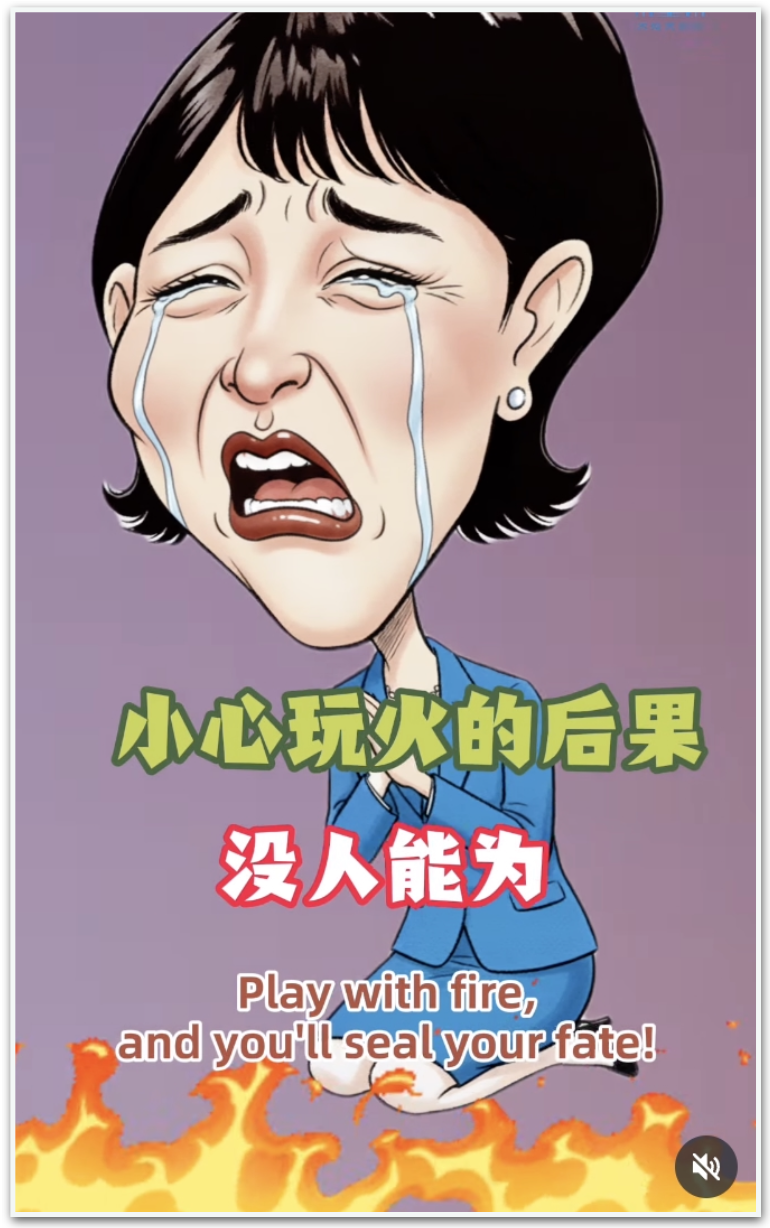 A CCTV (Televisão Central da China) publicou na semana passada em suas redes um vídeo com uma música em que chama Takaichi de “sabotadora” e “provocadora”. Em um dos trechos, ela está chorando e chamas aparecem sob a ministra com os dizeres: “brinque com fogo e você selará seu destino”.