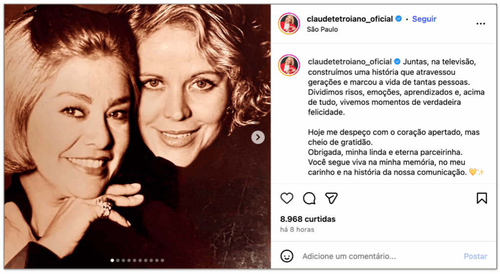 Troiano homenageou e se despediu da ex-colega em uma publicação nas redes sociais: “Hoje me despeço com o coração apertado, mas cheio de gratidão. Obrigada, minha linda e eterna parceirinha. Você segue viva na minha memória, no meu carinho e na história da nossa comunicação”, declarou.