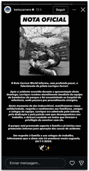 O Beto Carrero World, localizado no litoral norte de Santa Catarina, emitiu nota oficial sobre o caso. “O parque está prestando suporte à família e já iniciou seus protocolos internos para apuração das causas do acidente. Em respeito à família e aos colegas de trabalho, informamos que o show não irá acontecer nesta segunda-feira”, diz o texto, publicado nos Stories do Instagram.