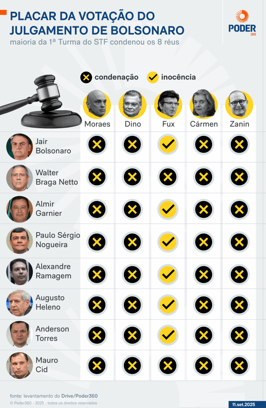 A 1ª Turma do STF condenou Bolsonaro em 11 de setembro de 2025 por 5 crimes, incluindo tentativa de golpe de Estado. Votaram pela condenação do ex-presidente e dos outros 7 réus: Alexandre de Moraes, Flávio Dino, Cármen Lúcia e Cristiano Zanin.