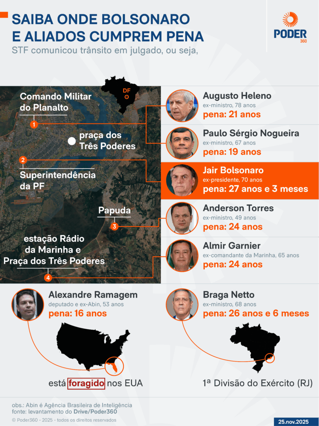 - Jair Bolsonaro: ex-presidente da República e capitão da reserva do Exército, cumpre pena de 27 anos e 3 meses de prisão na Superintendência da Polícia Federal do Distrito Federal, em Brasília;