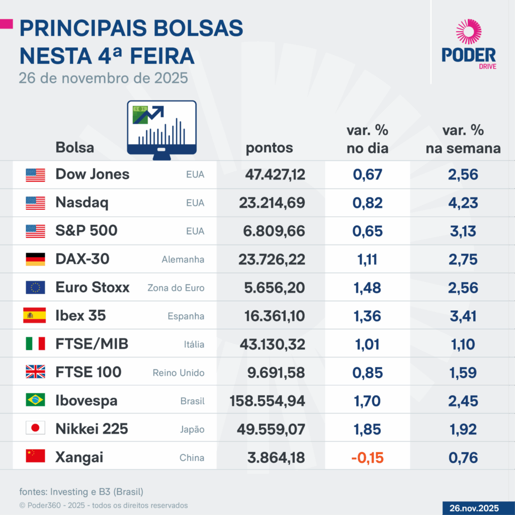O desempenho da Bolsa brasileira supera a maior pontuação anterior no fechamento –157.748,60 pontos em 11 de novembro. O Ibovespa acompanhou o movimento dos principais índices norte-americanos, que também subiram nesta 4ª feira (26.nov).