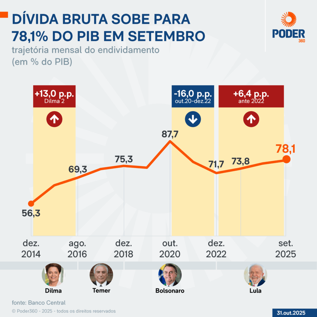 Já o BC (Banco Central) afirmou, em outubro, que a DBGG (Dívida Geral do Governo Geral) havia sido de 78,1% do PIB em setembro. Os agentes financeiros estimam um endividamento de 79,5% do PIB no fim deste ano.