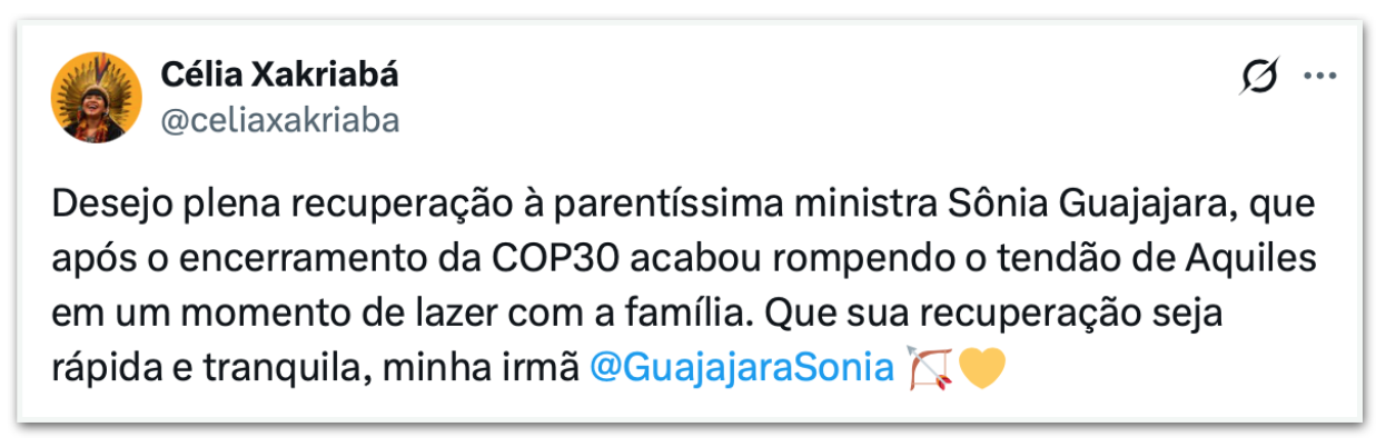 “No final de semana, a ministra Sonia Guajajara rompeu o tendão de Aquiles, após encerramento da COP30, em momento de lazer com a família. A ministra passou por uma cirurgia bem-sucedida, no Hospital Brasília, e retornará às atividades assim que receber alta médica”, diz o comunicado.