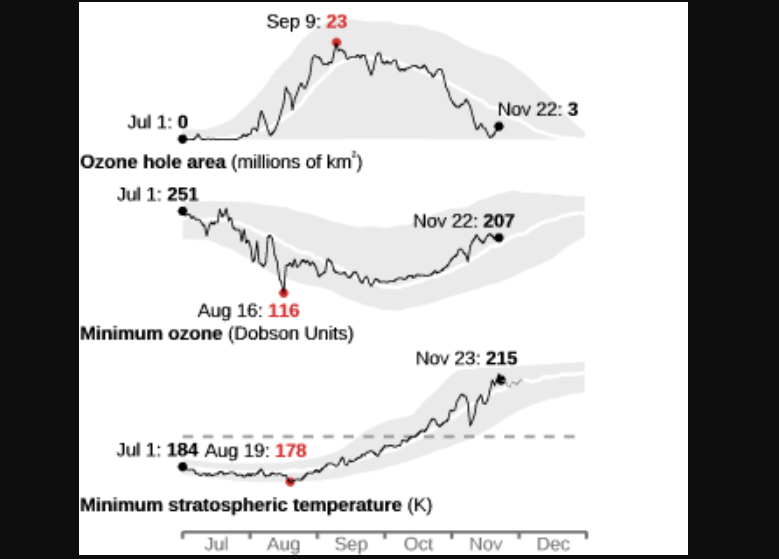 O buraco na camada de ozônio atingiu sua maior extensão em um único dia em 9 de setembro, com 22,86 milhões de quilômetros quadrados. Ele foi cerca de 30% menor do que o maior buraco na camada de ozônio já observado, que ocorreu em 2006 e teve uma área média de 26,60 milhões de quilômetros quadrados.