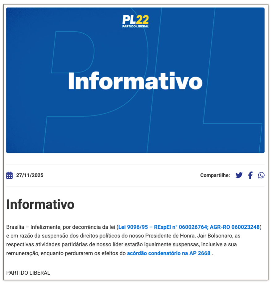 “Infelizmente, por decorrência da lei (Lei 9096/95 – REspEl n° 060026764; AGR-RO 060023248) e em razão da suspensão dos direitos políticos do nosso presidente de honra, Jair Bolsonaro, as respectivas atividades partidárias de nosso líder estarão igualmente suspensas, inclusive a sua remuneração, enquanto perdurarem os efeitos do acórdão condenatório na AP 2668“, divulgou o partido.