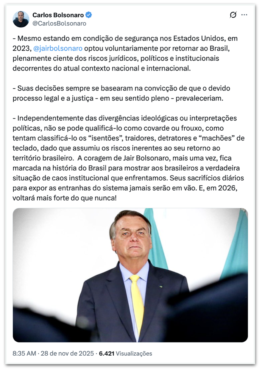 Em outra publicação em seu perfil no X, também em uma versão em inglês, Carlos falou reagiu a críticas de que Bolsonaro teria buscado fugir de investigações. Disse que o ex-presidente voltou ao Brasil em 2023, depois de passar o fim de ano nos Estados Unidos e evitando a posse de Lula, porque acreditava que “a Justiça prevaleceria”.